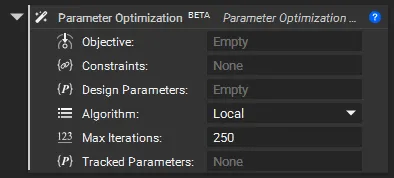 - The Parameter Optimization block runs an optimization algorithm to find the optimal collection of Design Parameters satisfying the Objective while satisfying all Constraints.