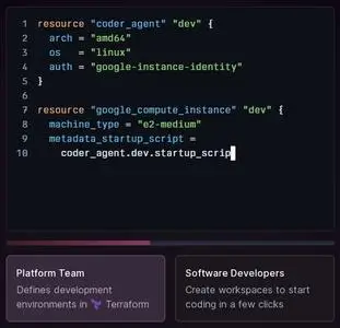 Coder is an open source cloud development environment (CDE) that you download and host in your cloud. Deploy a single solution in seconds that provisions the infrastructure, IDE, language, and tools your developers desire. Upgrade to the Enterprise version and add security, governance, and observability capabilities for Platform teams.