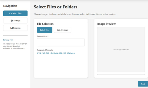 Image Metadata Cleaner is a powerful, privacy-first application designed to help you remove sensitive metadata from your images while preserving their quality. Perfect for photographers, content creators, and privacy-conscious users who want to share images without exposing personal information.