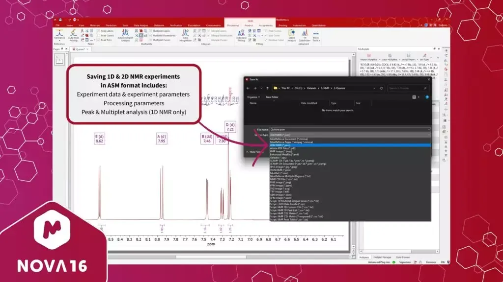 For 1D and 2D NMR experiments, Mnova saves the following information in ASM: