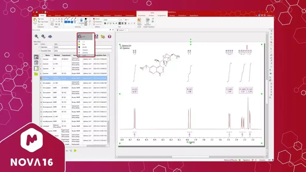 Mnova 16.0.0is a powerful, multi-vendor software suite designed to seamlessly process and analyze data from NMR, LC/GC-MS, and Electronic & Vibrational Spectroscopic techniques. Our platform is built to work with a wide range of instruments, offering unmatched versatility and precision for your analytical needs