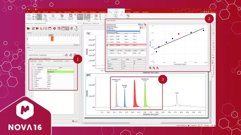 Figure 8. 1- Multiple target results including internal standard and calibration modes; 2- Specific calibration curves;