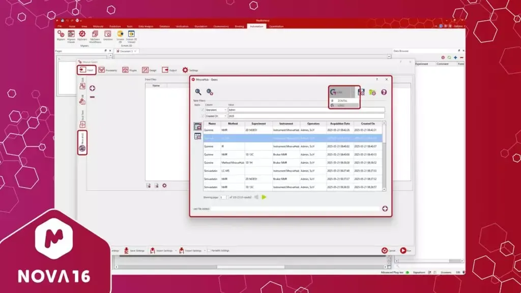 5.1 Mnova Hub now available in Mgears as a new inputMgears can now retrieve input data directly from LOGS or ZONTAL data management platforms through Mnova Hub for analysis, simplifying data integration processes.