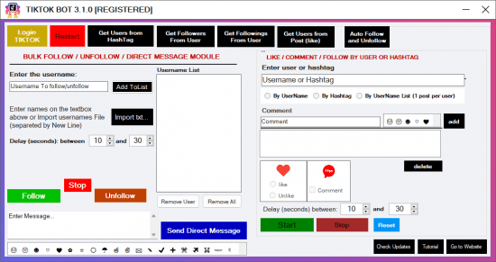 TikTok Bot Pro automate your "likes" and "comments", search for new followers profiled by similar accounts and get real followers interested in your content. Here is the list of features you will find in this software