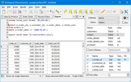 GoldSqall is an SQL query, editing and exporting tool. GoldSqall can natively connect to Oracle, PostgreSQL, MySQL, Firebird and SQL Server. GoldSqall also allows connecting to any database with OLEDB or ODBC drivers. GoldSqall has an advanced syntax highlighting SQL Editor and formatter, a lightning fast datagrid with sorting, filtering, data formatting and a transposed view mode.