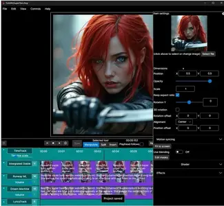 You don't need to be professional video editor to use this app (but you can be :) ). DAW-like horizontally scrolling multi-track timeline, familiar from all digital audio workstations, is used to keep track of you items. Lyric, video, audio, primitive and generative AI tracks, as many as you want and need, keeping mind you PC performance. Includes integrated library for video import & export and also support using FFMPEG optionally. This is the video maker rethought from the scratch!