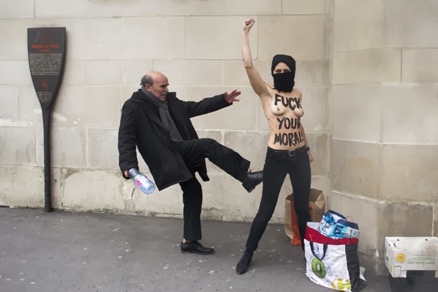 Uma ativista da Femen é pontapeada, em abril, durante uma ação junto a uma mesquita de Paris