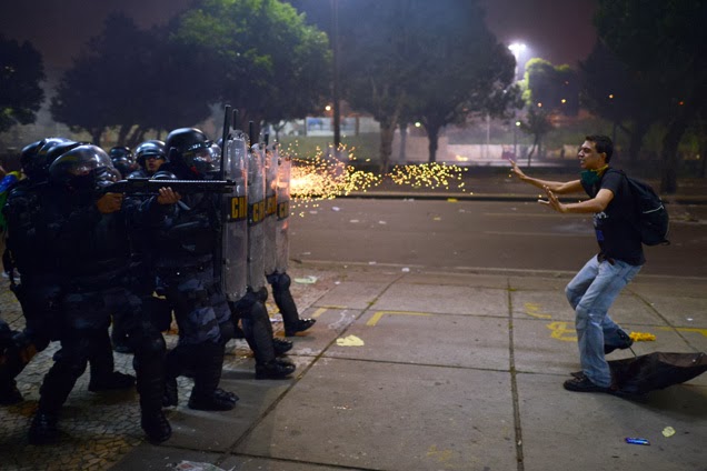 Um manifestante é baleado por balas de borracha durante protestos contra o aumento dos preços dos transportes, a 20 de junho de 2013, no Rio de Janeiro