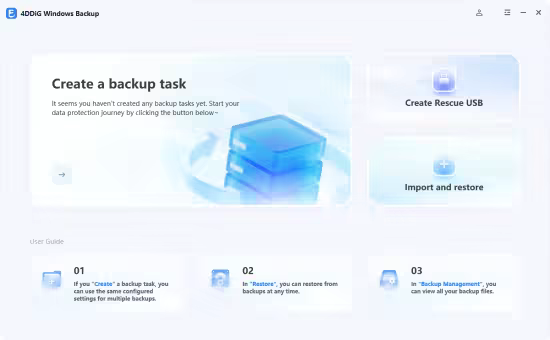 Deletion, overwrite, corruption or sudden crash can cause data loss. To keep data safe, easily create a backup of your files, partition, disk or system with 4DDiG Windows Backup. Create a backup task, select what you want to backup and where you store the backup. Complete the backup process, and you can restore it at anytime.
