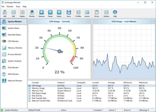 The SysGauge system monitoring utility provides a large number of different types of performance monitoring, system resource monitoring and operating system status monitoring counters and allows one to select which counters to monitor. In addition, users are provided with the ability to specify how to display the performance monitoring results for how long to keep the results history.