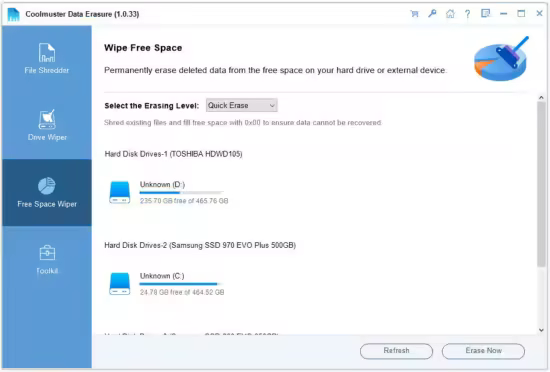 Erase residual data from free space without affecting existing files-supports both fast and DoD-certified deep wiping.