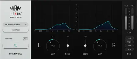 Developed by Brainworx in collaboration with the HEARS team, HEARS Perfection is the next generation of personalized hearing compensation. Using an optimized built-in hearing test, it pinpoints exactly where your hearing falls short and applies real-time correction - providing you with a perfectly flat and neutral listening environment tailored to the unique listening profile of your own ears.