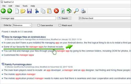SeekFast is an extremely fast and easy to use program that can search for a text in multiple files in a folder on your computer. If you are using the full version, you will be able to search thousands of documents. Searching is easy and convenient, and although SeekFast has a Help section, the program is easy enough to use without even reading the information in it. All you have to do is choose a directory to search and enter search words or phrases - you will get all the sentences in which they occur in seconds. This is particularly useful if you need to find something quickly.