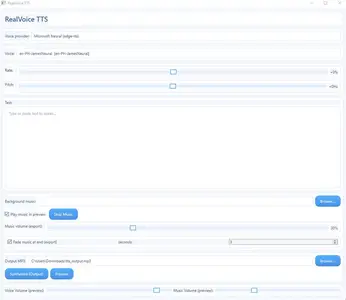 RealVoice TTS turns your text into natural-sounding speech using Microsoft neural voices. Preview instantly, fine-tune rate and pitch, then export high-quality audio. Add background music, adjust volumes, and optionally fade the music at the end for a clean finish. The app is designed to be simple, fast, and reliable-great for creators, educators, podcasters, and anyone who needs voiceover audio quickly.