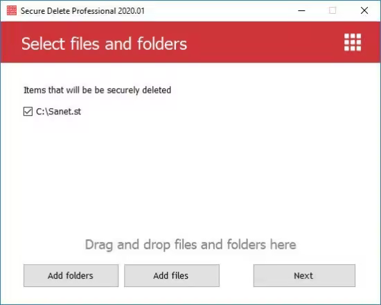 This application can be used in three ways. (1) Drag and drop the files or folders which you want to be securely deleted to the main window. (2) Select the necessary files by clicking Add Files on the main screen. Or (3) select any file or folder on Windows Explorer and choose the Send To option, then click Secure Deleter.
