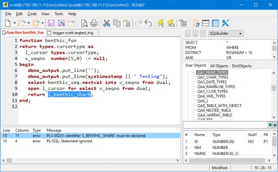 PLEdit allows editing and compiling of PL/SQL code modules (stored procedures.) It is optimized to be quick and resource friendly.
