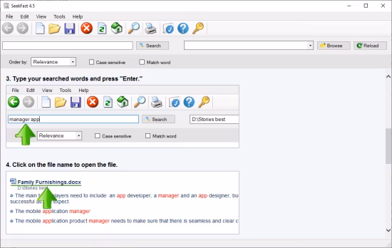 SeekFast is an extremely fast and easy to use program that can search for a text in multiple files in a folder on your computer. If you are using the full version, you will be able to search thousands of documents. Searching is easy and convenient, and although SeekFast has a Help section, the program is easy enough to use without even reading the information in it. All you have to do is choose a directory to search and enter search words or phrases - you will get all the sentences in which they occur in seconds. This is particularly useful if you need to find something quickly.