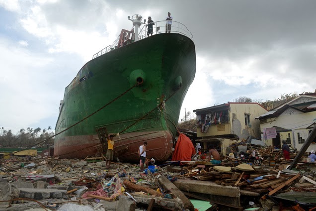 Pessoas entre os escombros deixados pelo tufão em Tacloban, Filipinas